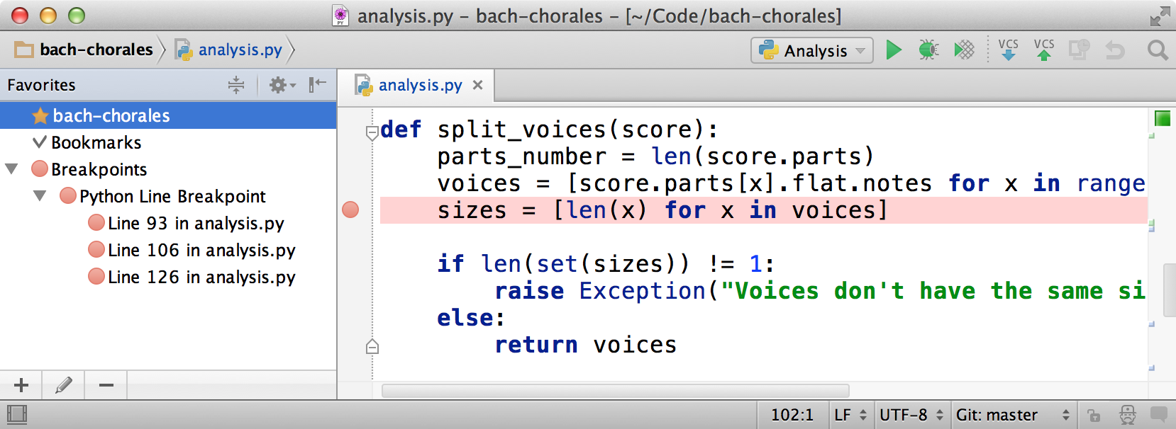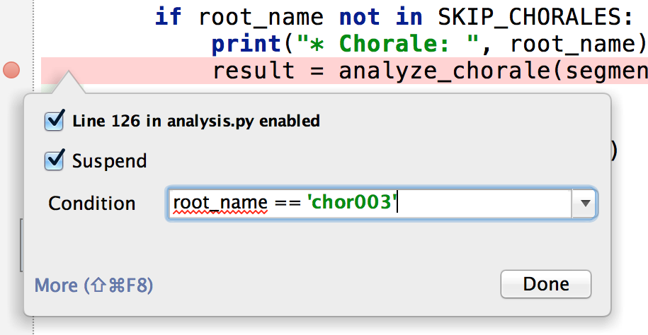 Another way to disable a breakpoint is by right-clicking on it and unchecking the first option (“Line 93 in analysis.py enabled” in the following example).