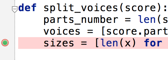 One of the main differences between running and debugging a script is that in debugging we want to define breakpoints. In PyCharm, a breakpoint must be on a line with working code; it can’t be on a line that is blank or starts with a comment. We create breakpoints by clicking on the gutter on the left.