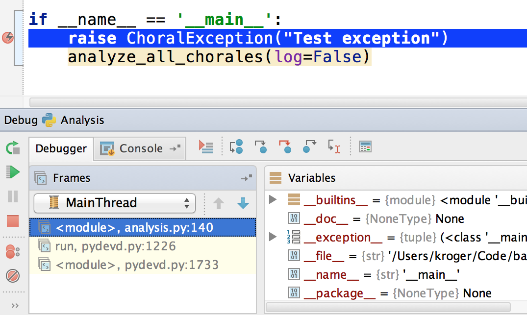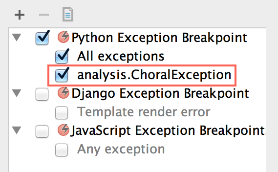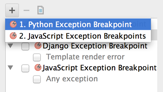 Besides defining breakpoints when a line of code is reached, we can define a breakpoint that is triggered when an exception is thrown. To add an exception breakpoint, we go to Run→View Breakpoints… (⌘-S-F8, S-C-F8) and select Python Exception Breakpoint after clicking the + button.