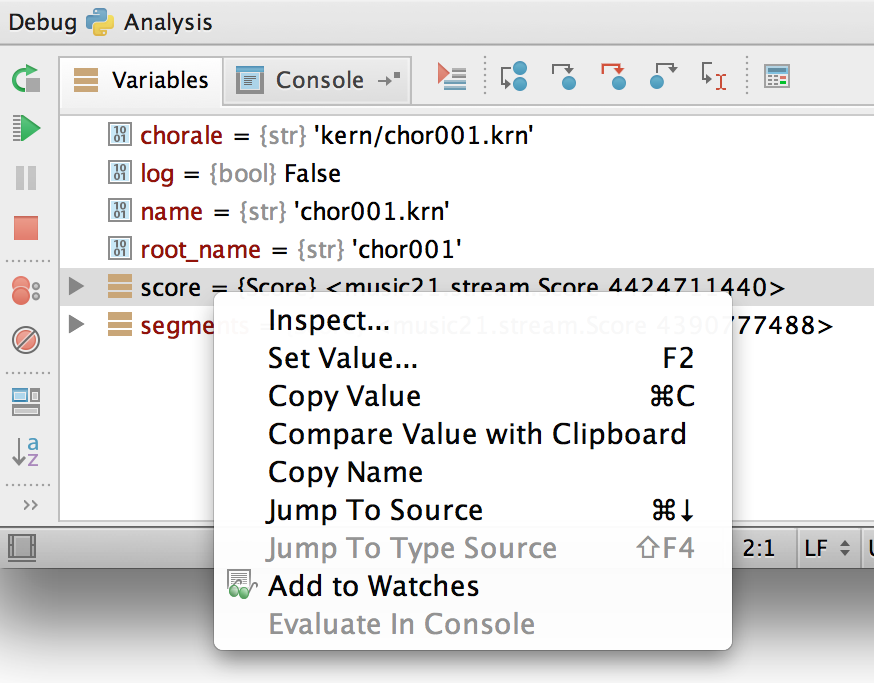 And, as expected, we can inspect and set a variable value by choosing the correct option in the popup menu on the Variables pane.