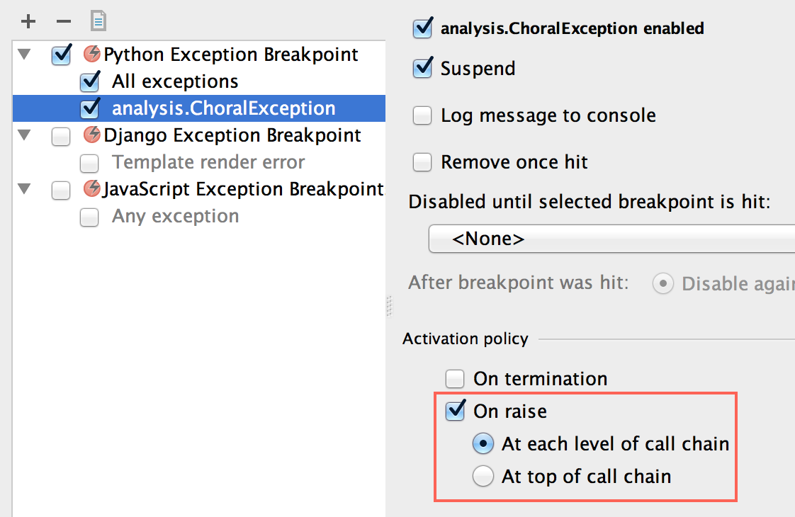 In most cases, we want to activate the breakpoint when the exception is raised (the default is to activate the breakpoint when the exception terminates):