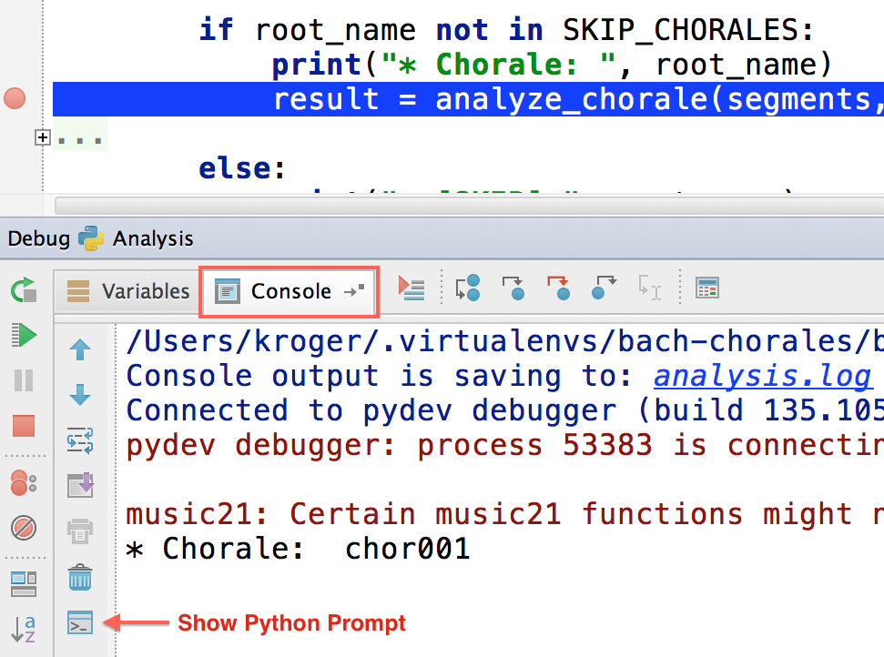 Sometimes it’s useful to be able to access a Python prompt while debugging. We can do this by clicking on the Console tab when the debugger is running and selecting the Show Python Prompt icon.