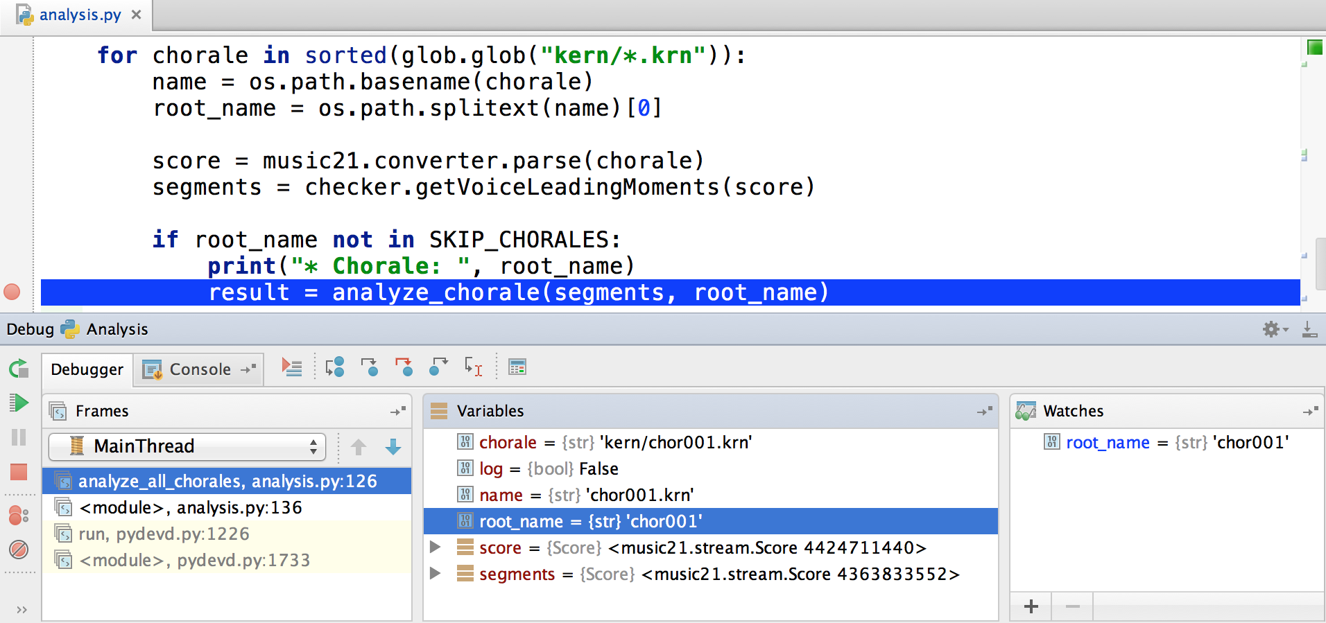 PyCharm’s debug tool window has everything we expect in a graphical debugger. From here we can navigate the call stack and inspect the data available in each stack frame. We can keep an eye on some variables by adding them to the watch list.