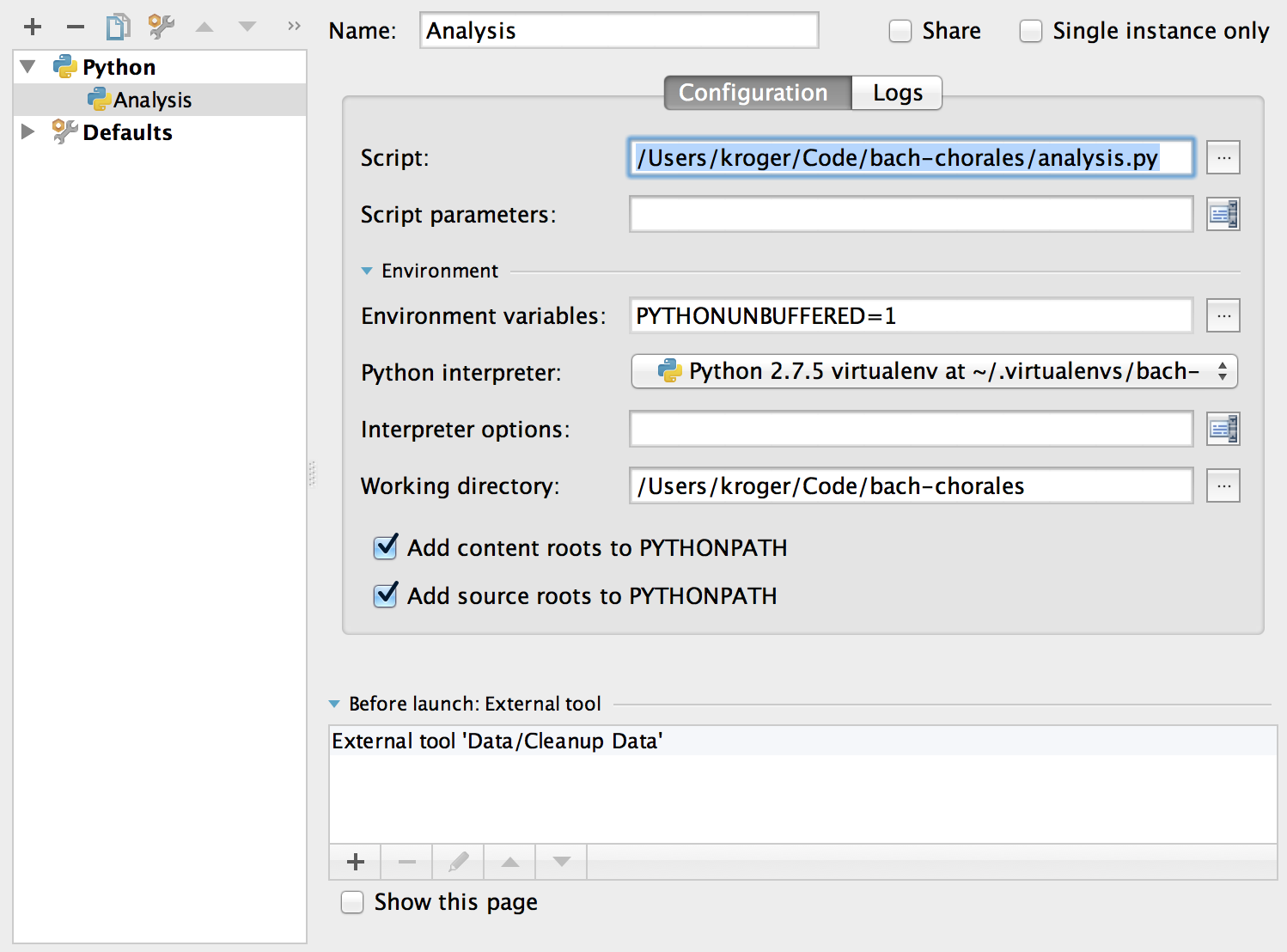 PyCharm creates a new configuration named analysis: