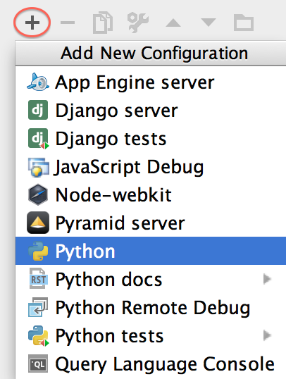 When we want to run things with more control we need to create a configuration by going to Run→Edit Configurations… and clicking on the + button (⌘-n, A-Insert). PyCharm will ask what type of configuration we want (that is, if we want to run a Python script, a Django or Pyramid server, and so on) and will show the appropriate options for each type.