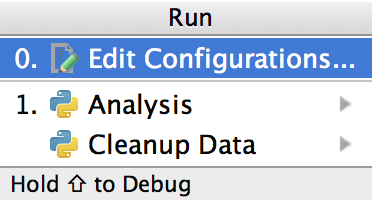 To run a script for the first time, we need to either create a configuration (Run→Edit